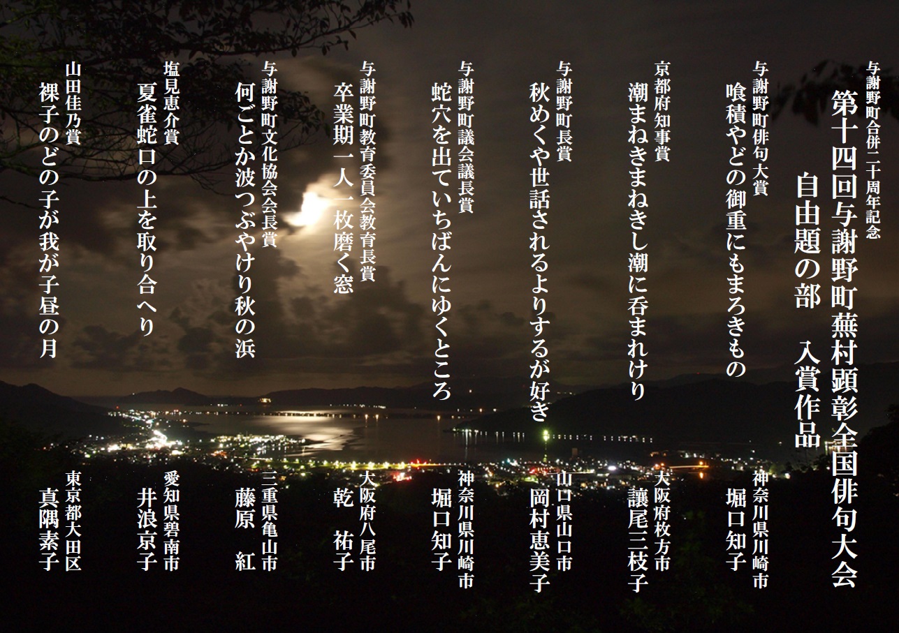 14回目となる今回は毎年恒例の「自由題の部」「前書俳句の部」に加えて「与謝野町合併20周年記念部門 与謝野をうたう」として与謝野町を題材にした句の身を募集・選考する部門を特設しました。