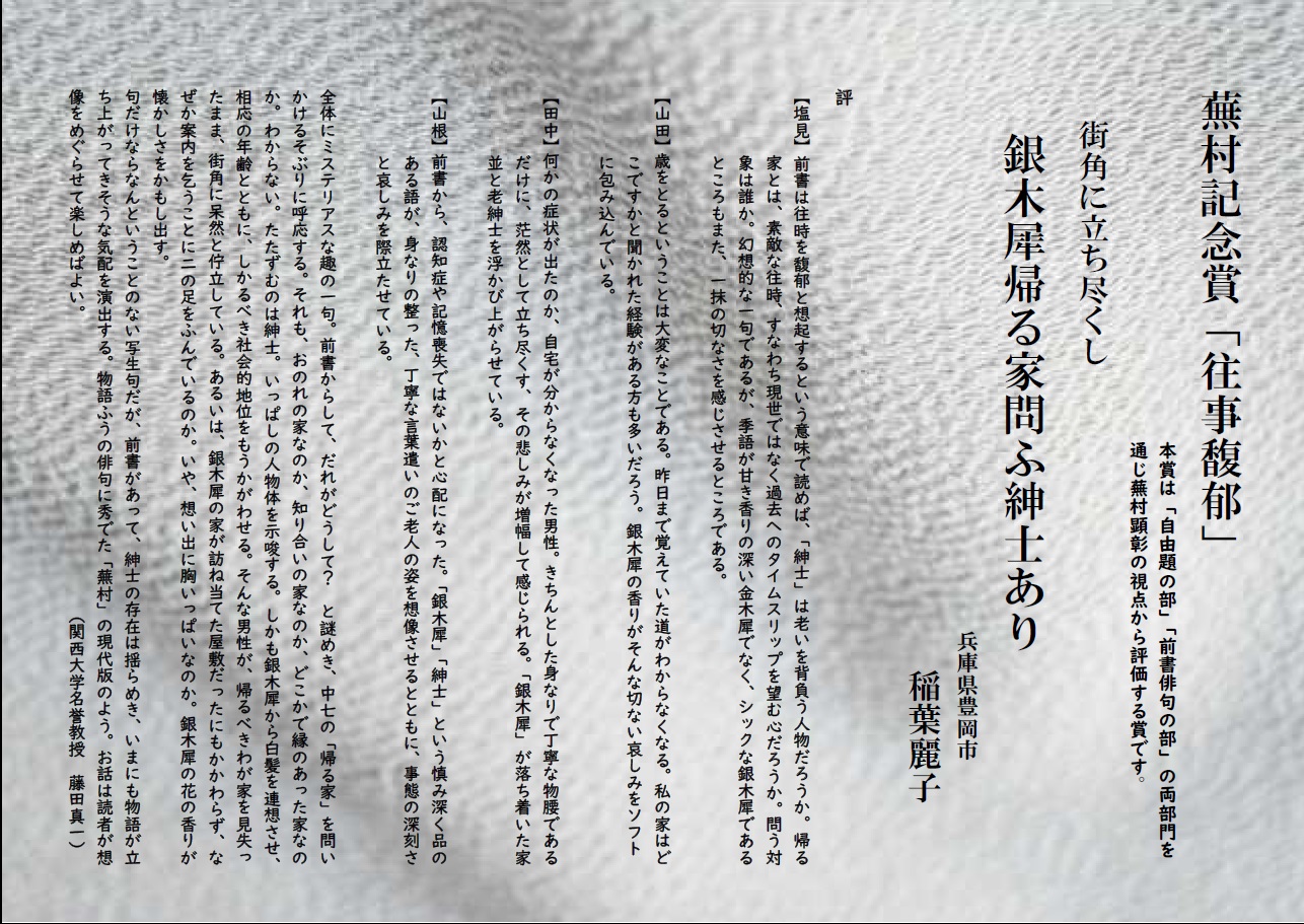 画像をクリックするとpdfが開き、入選作もご覧いただけます。事前投句作品については入賞句講評も記載しています。