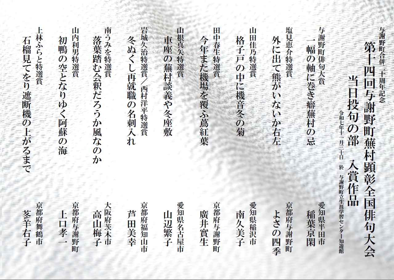 令和7年11月30日(日)に「与謝野町合併20周年記念 第14回与謝野町蕪村顕彰全国俳句大会」を終了しました。